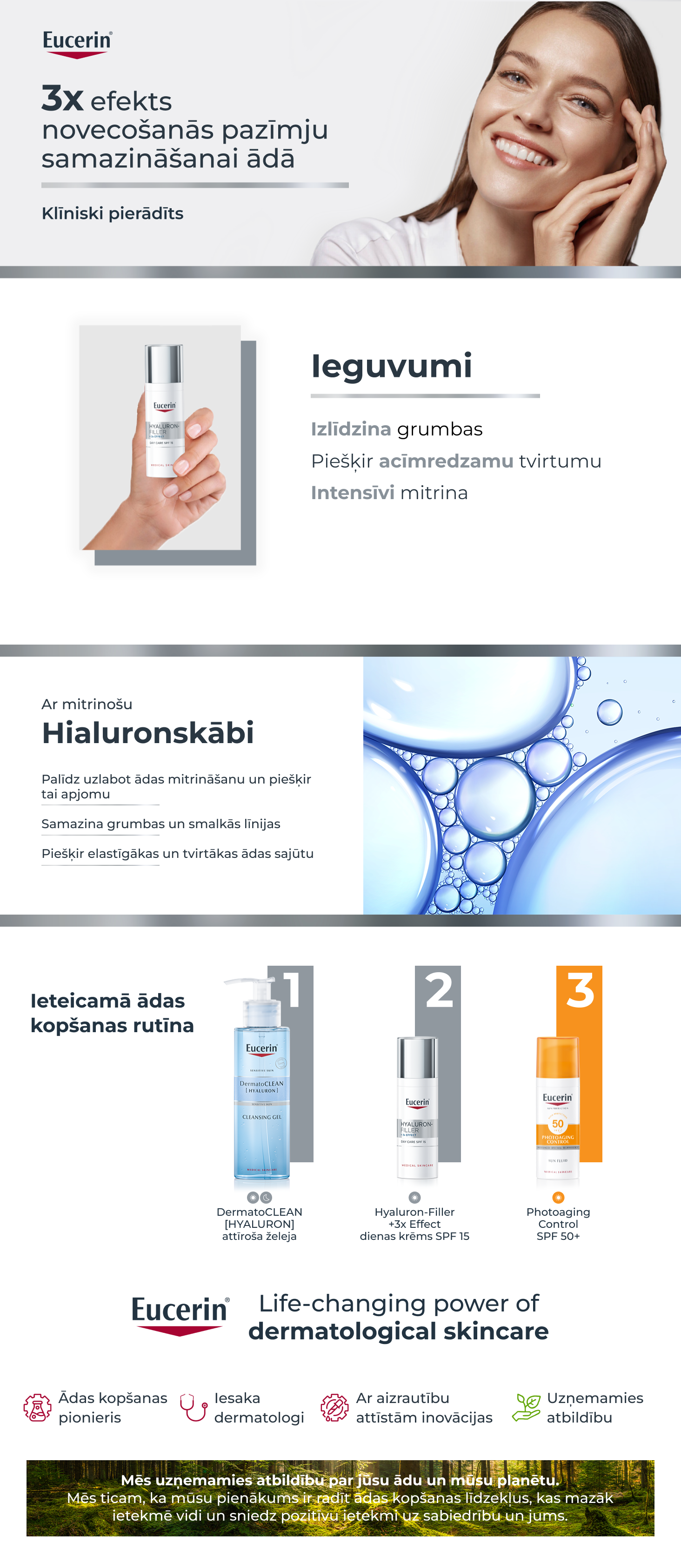 Novecojot, samazinās dabiskās hialuronskābes līmenis ādā, kas izraisa mitruma zudumu, sīko krunciņu veidošanos un dziļākas grumbas. Eucerin Hyaluron-Filler +3x Effect dienas krēms ar SPF 15 ir izstrādāts normālai un kombinētai ādai, nodrošinot dziļu mitrināšanu.