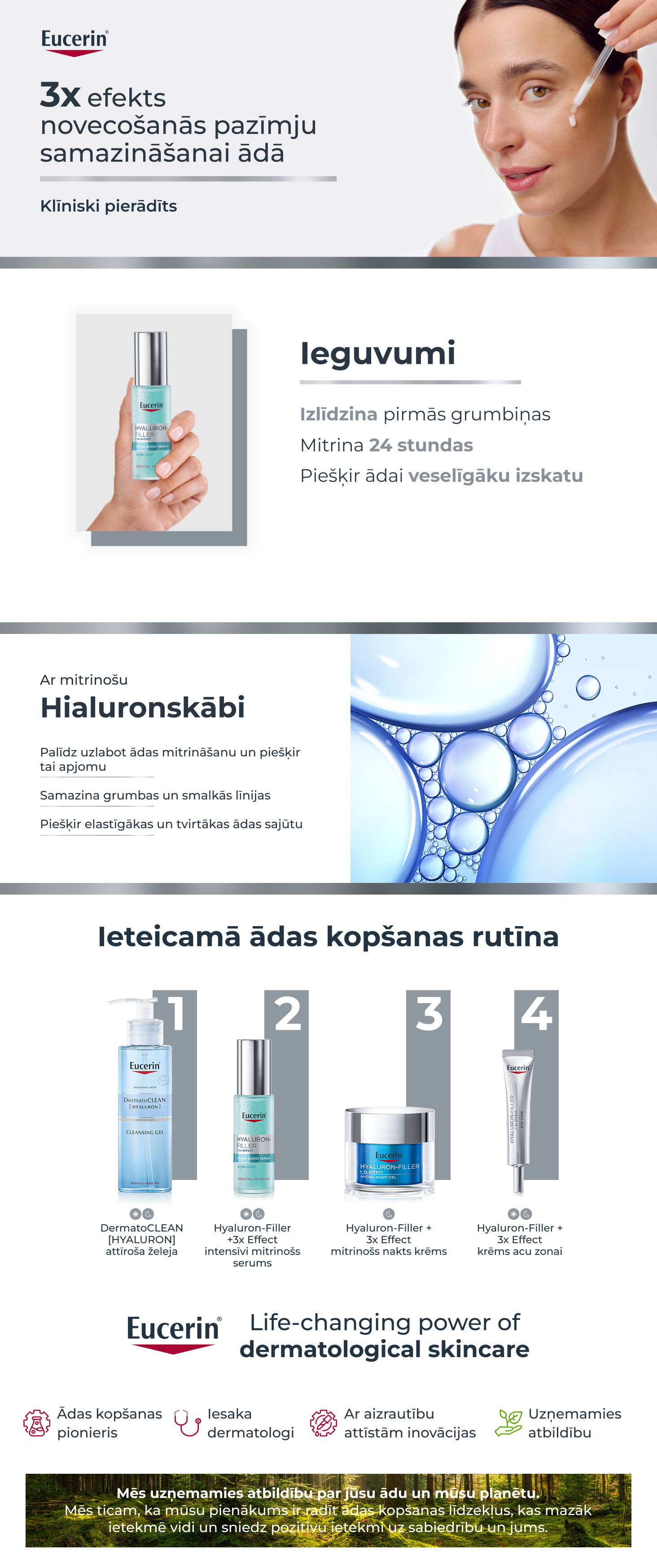 Eucerin Hyaluron-Filler +3x Effect intensīvi mitrinošais serums nodrošina tūlītēju un ilgstošu, līdz pat 24 stundām, intensīvu mitrināšanu. Šis hialuronskābes serums izlīdzina pirmās grumbiņas, lai āda izskatītos gluda un veselīga.