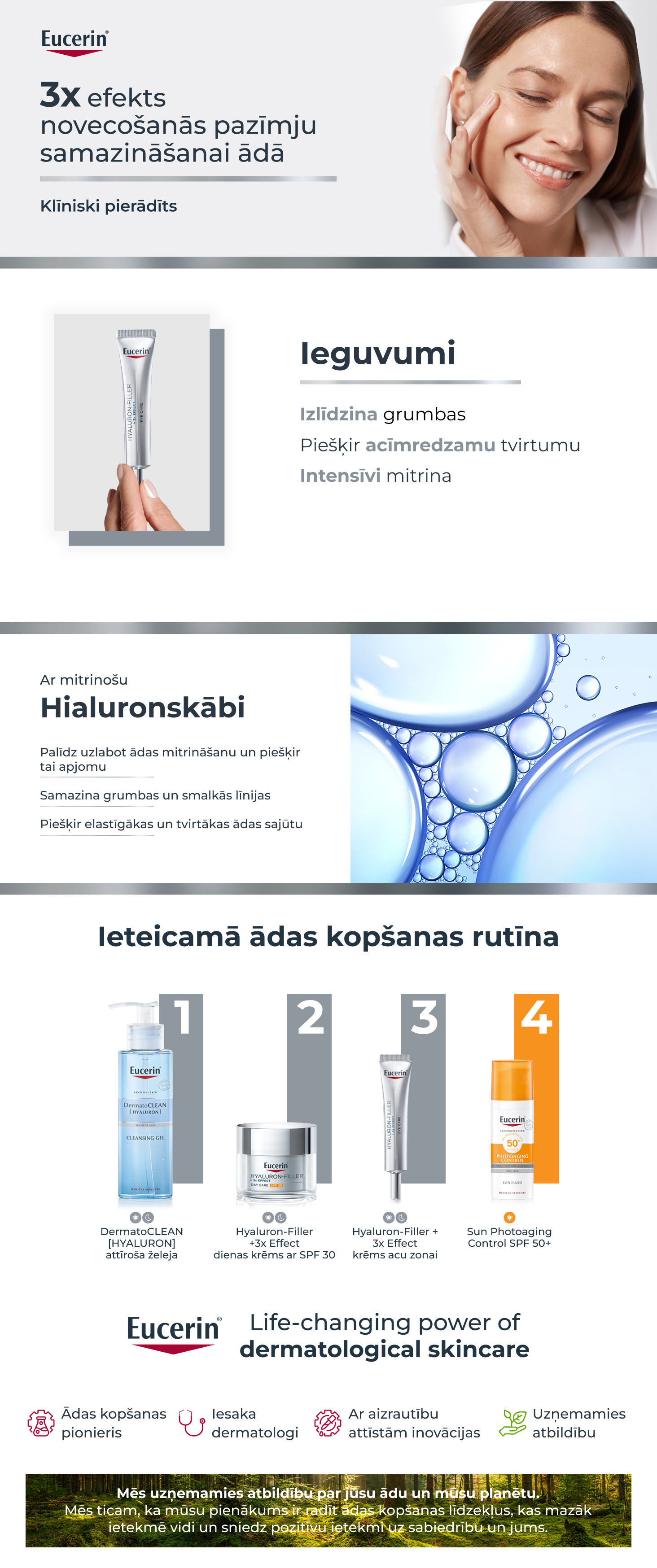 KLĪNISKI UN DERMATOLOĢISKI PĀRBAUDĪTS: Eucerin Hyaluron-Filler +3x Effect acu krēms ir klīniski un dermatoloģiski pārbaudīts, un tam ir ļoti laba ādas panesamība un efektivitāte.