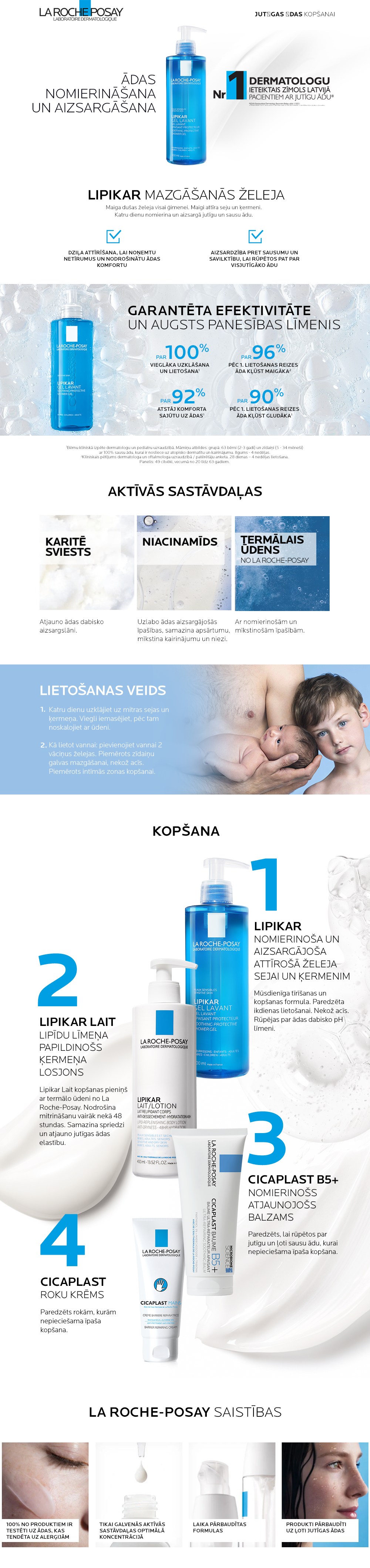 Lipikar Gel lavant ir maiga putojoša dušas želeja. Tās sastāvā ir labākās aktīvās sastāvdaļas ādas ikdienas attīrīšanai un nomierināšanai- Niacinamīds un La Roche Posay termālais ūdens nomierina ādu, Karitē koka sviests un Glicerīns papildina to ar lipīdiem un mitrina. LIPIKAR GEL LAVANT piemērots lietošanai visai ģimenei dažādām ķermeņa zonām. Pārbaudīts dermatologu, pediatru, ginekologu un oftalmologu kontrolē.