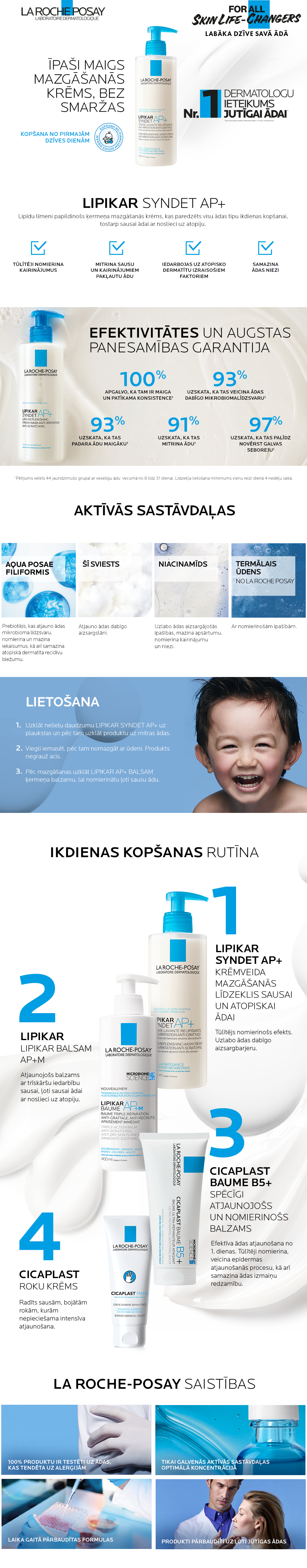 Sausas un atopiskas ādas kopšanai jau no mazgāšanas brīža. Sastāvā Karitē koka sviests un Niacinamīds, La Roche Termālais avotu ūdens un patentētais Aqua Posae Filiformis (baktērijas lizāts), kas veicina normālas ādas mikrofloras atjaunošanos. Palīdz nostiprināt ādas aizsargbarjeru un atjaunot dabisko ādas mikrofloras līdzsvaru*. Piemērots jaundzimušajiem**, zīdaiņiem, bērniem un pieaugušajiem ar sausu un/vai atopisku, niezošu ādu. Var izmantot mazuļa galvas ādas kopšanā*** (piena krevele). Nekairina acis. * Klīniskais pētījums, 32 pacienti ar vieglu un vidēji smagu atopisko dermatītu (SCORAD 30), 18-61 g, lietoja tikai Syndet AP+ 1x dienā/, 2 ned; mikrobioma novērtējums D1 un D14, klīn novērtējums D1 un D14. **Pediatru un dermatologu kontrolē veikts klīnisks drošības novērojums 40 jaundzimušajiem līdz 1 mēneša vecumam. *** 4 nedēļu novērojums, 16 mazuļi.