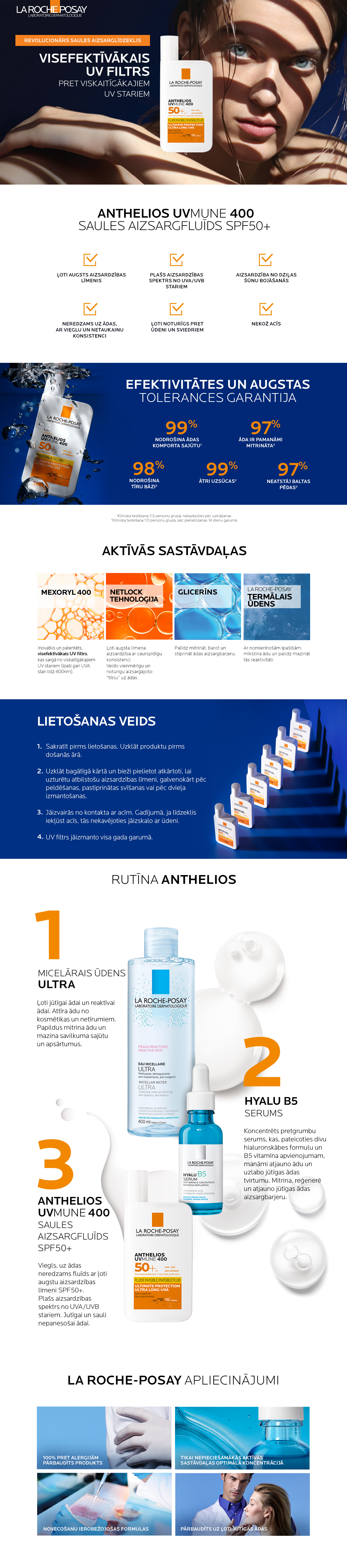 LA ROCHE POSAY saules aizsargfluīds sejai ANTHELIOS UVMUNE INVISIBLE FLUID SPF 50+. Jutīgai un sauli nepanesošai ādai vislabākais aizsargfiltrs, kas pasargā pret īpaši gariem UVA stariem līdz 400nm, ko uzskata par visviltīgākiem stariem, pasargājot ādu pret šūnu bojājumiem. Īpaši spēcīga izturība pret ūdeni, sviedriem un smiltīm. Fluīdam ir neredzama, caurspīdīga tekstūra ar nelipīgu un netaukainu efektu, īpaša formula kas kavē produkta migrāciju un neiekļūst acīs.