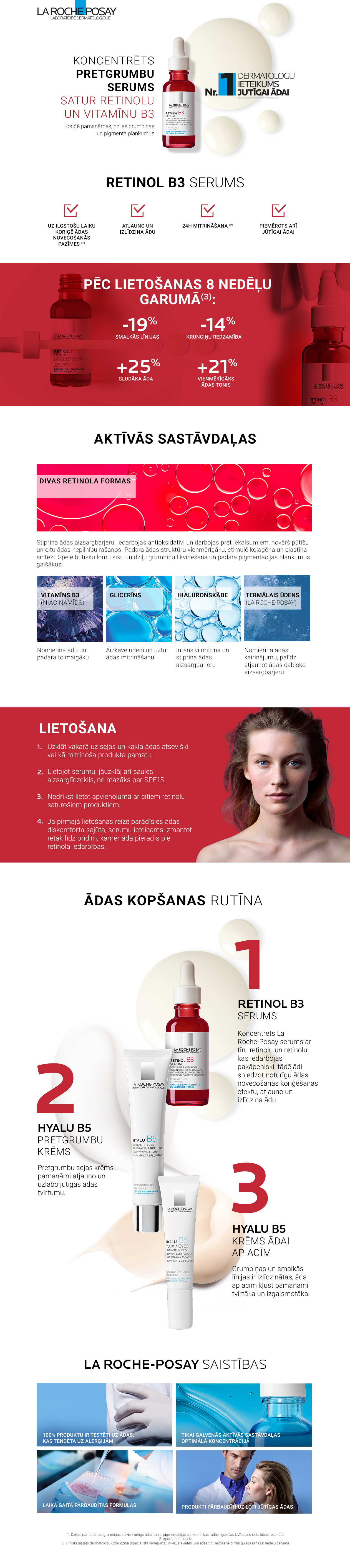 Inovācija: unikāls, koncentrēts pretgrumbu serums ar tīru retinolu un pakāpeniski atbrīvojošu retinolu, kas koriģē ādas novecošanas pazīmes: redzamas, dziļas krunciņas. Atjauno, nomierina, nogludina ādu un smalkās grumbiņas. Formula ir bagātināta ar [glicerīnu] un [hialuronskābi] ar mitrinošu iedarbību, [vitamīns b3 (niacinamīds)] ar nomierinošu iedarbību. 24 stundu mitrināšana*. Unikāla formula, kas veidota optimālai panesamībai jebkuram ādas tipam, arī jutīgai ādai.