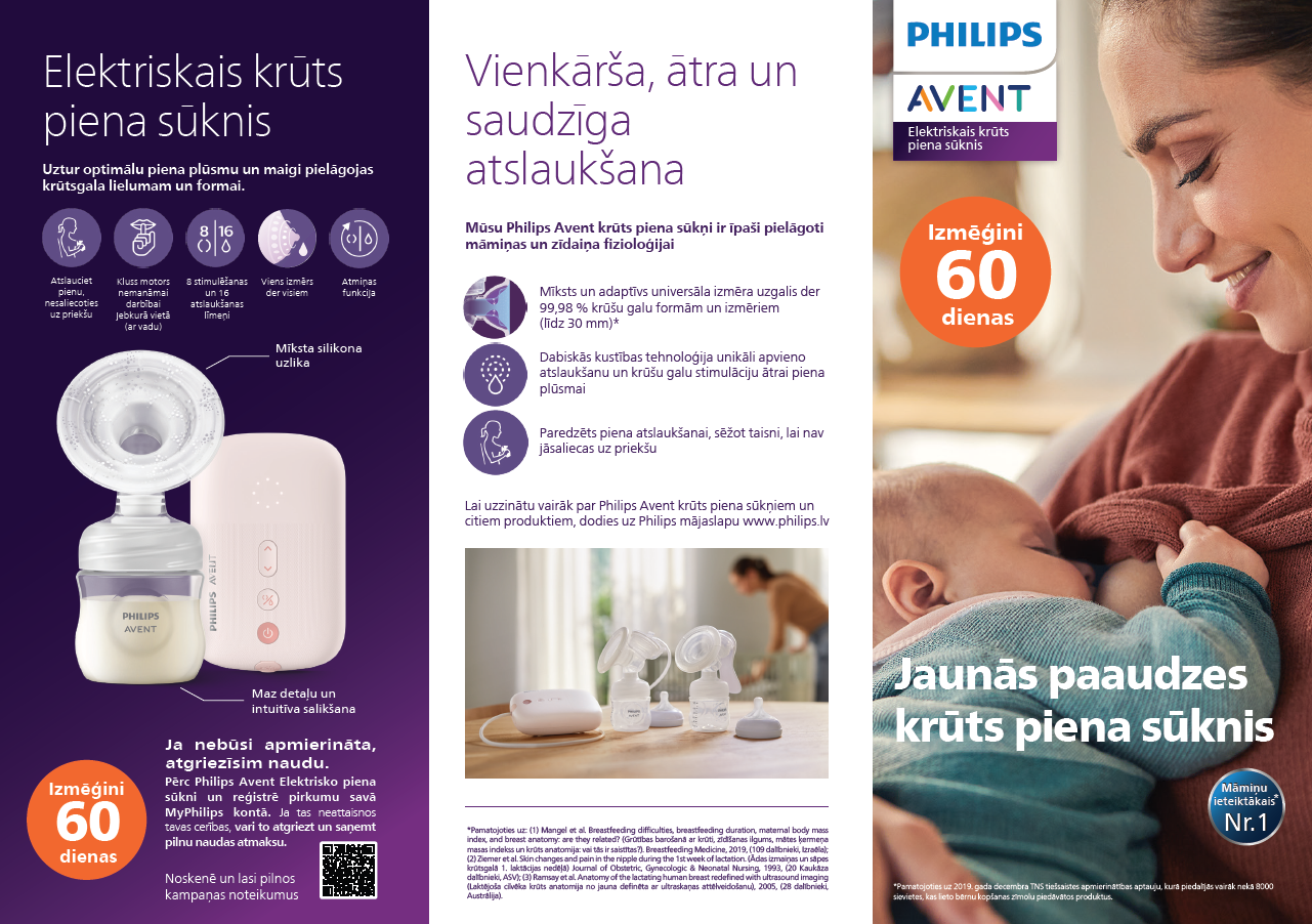 Atklāj jaunu atslaukšanas pasauli, kurā valda ideāls sūkšanas un krūšu galu stimulācijas līdzsvars, ko iedvesmojis mazuļu dabīgais zīšanas veids. Elektriskais piena sūknis Philips Avent uztur optimālu piena plūsmu un maigi pielāgojas krūšu gala lielumam un formai.