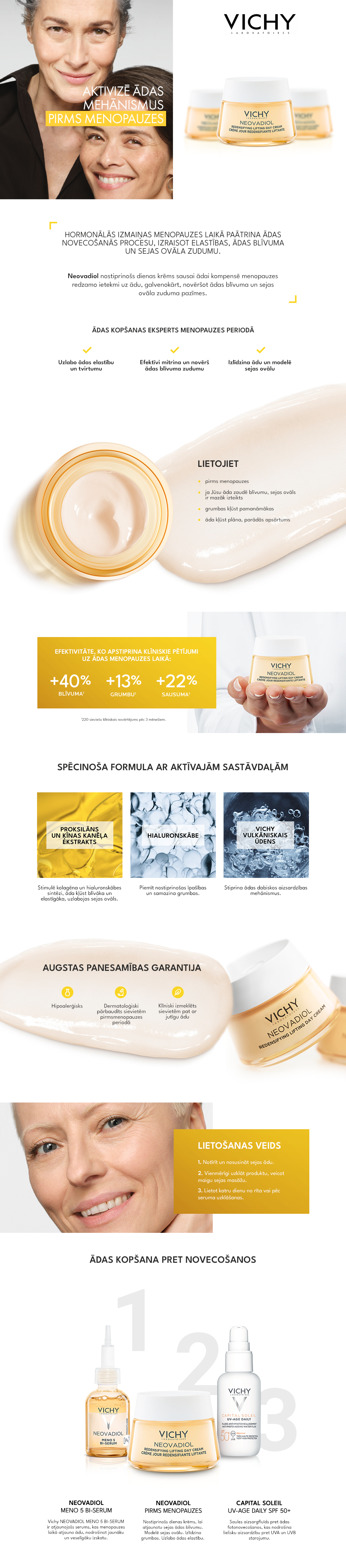 NEOVADIOL COMPENSATING COMPLEX blīvumu atjaunojošs, liftinga dienas krēms - sausai līdz ļoti sausai ādai. Krēms iedarbojas uz hormonu izraisītām novecošanās pazīmēm pēc 45 gadu vecuma: palīdz izlīdzināt un konturēt ādu, uzlabo elastīgumu.
