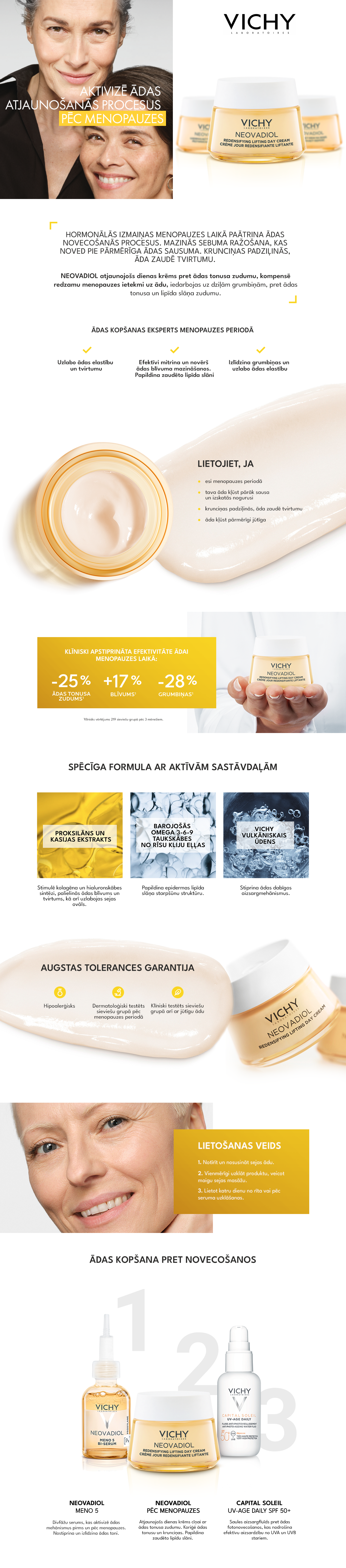 NEOVADIOL COMPENSATING COMPLEX blīvumu atjaunojošs liftinga dienas krēms normālai līdz jaukta tipa ādai. Iedarbojas uz hormonu izraisītām novecošanās pazīmēm pēc 45 gadu vecuma: palīdz izlīdzināt un konturēt ādu, uzlabo elastīgumu. Bagātināts ar proksilānu, augu izcelsmes kasijas ekstraktu un hialuronskābi, kas uzlabo ādas izskatu – āda izskatās blīvāka, pilnīgāka un acīmredzami tvirtāka.