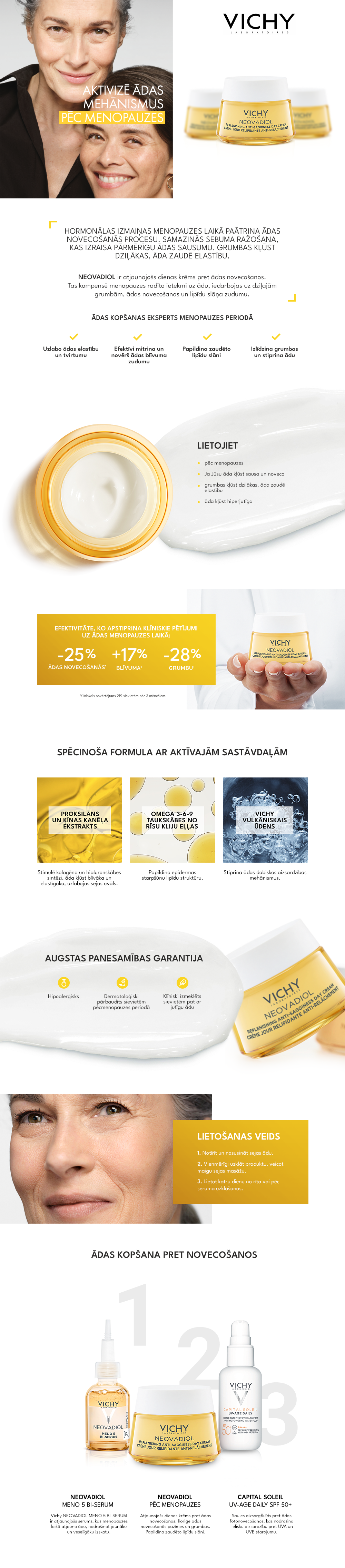 Iedarbojas uz hormonu izraisītām novecošanās pazīmēm pēc 50 gadu vecuma: atjauno zaudētos lipīdus, novērš vizuālās krunciņas, padara ādu stingrāku. Satur proksilānu, augu izcelsmes kasijas ekstraktu, Omega 3-6-9 taukskābes un niacinamīdu. Uzlabo ādas izskatu – āda izskatās stingrāka un gludāka.
