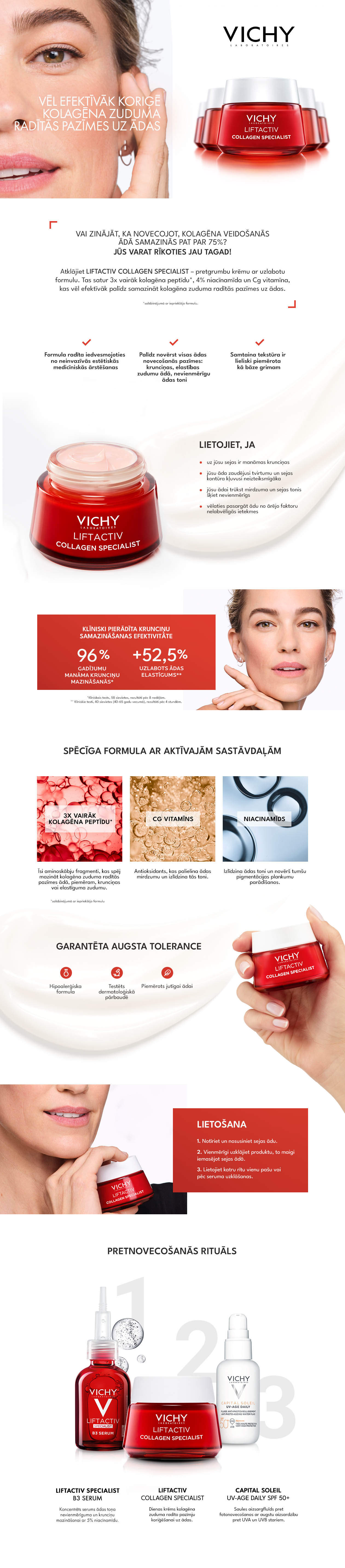 VICHY LIFTACTIV Collagen Specialist dienas krēms veicina ādas atjaunošanos, redzami samazina grumbas. Pēc vienas lietošanas reizes ādas tonuss uzlabojas un āda atgūst elastību.