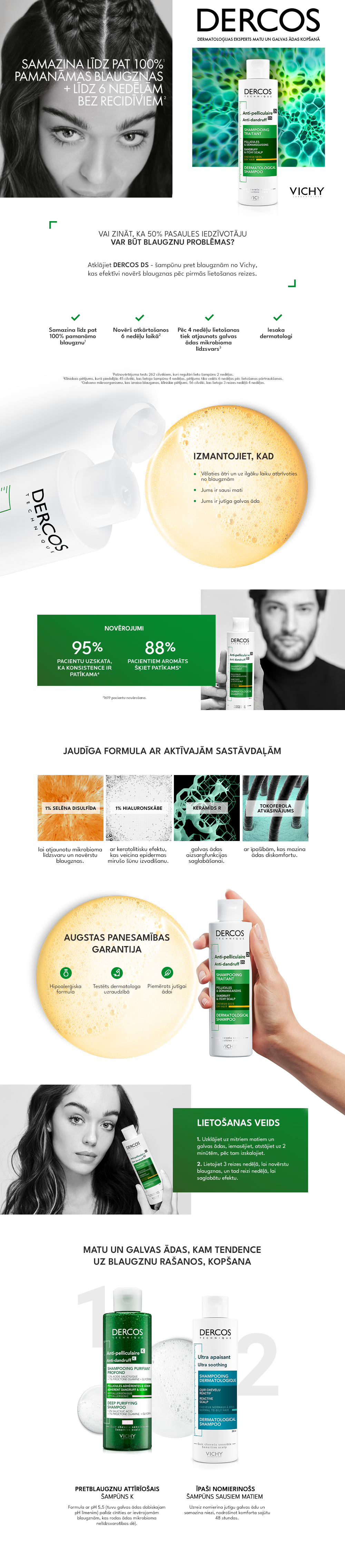 Vichy pretblaugznu šampūns, kas piemērots blaugznu un seborejiskā dermatīta gadījumos. Samazina niezi, likvidē blaugznas un atjauno galvas ādas balansu. Satur īpašu aktīvo vielu kompleksu: - Selēna disulfīds- references pretsēnīšu aktīvā viela; - tokoferols (e vitamīns) ar antioksidanta īpašībām; - salicilskābe- keratolītiska aktivitāte; - keramīds R galvas ādas aizsardzībai.