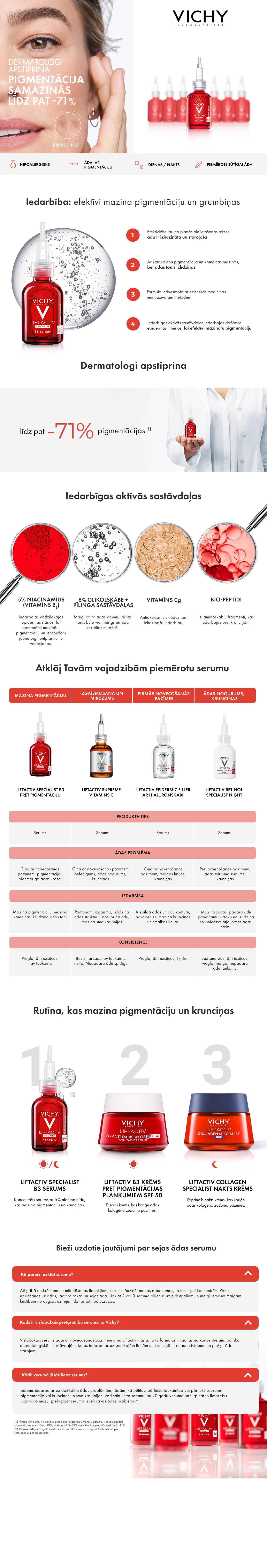 EKSPOSOMĀS ZINĀTNES: Novecošana un ārējie agresori, piemēram, piesārņojums un UV, var veicināt ādas pigmentāciju, grumbu parādīšanos un nevienmērīgu ādas toni. VICHY RISINĀJUMS: B3 serums pret pigmentāciju un grumbām. Hipoalerģiska formula ar ādu nostiprinošu Vichy vulkānisko ūdeni un koncentrētām sastāvdaļām: 5% niacinamīds, glikolskābe, vitamīns Cg un biopeptīdi manāmi uzlabo pigmentācijas un grumbu izskatu. Āda izskatās gluda un mirdzoša.Piemērots visiem fototipiem.