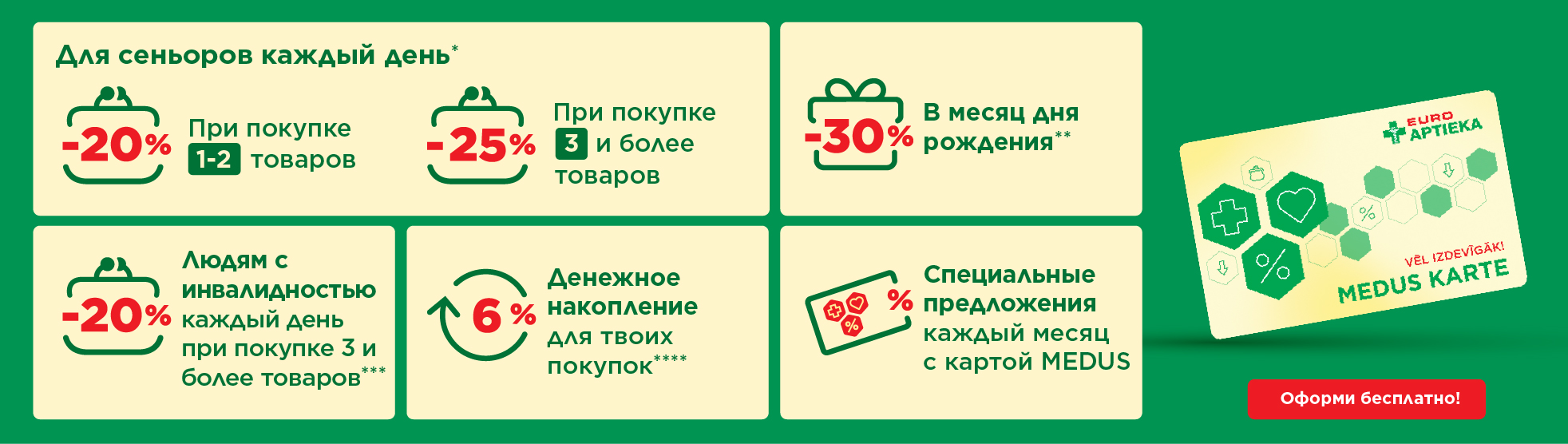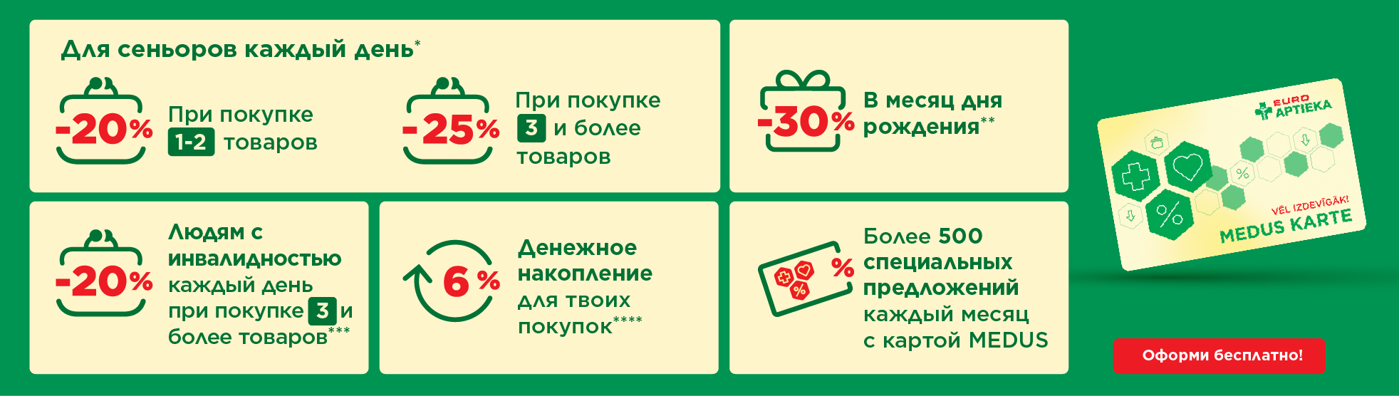 *Предложение действительно для лиц от 60 лет или при предъявлении пенсионного удостоверения. Скидка предоставляется при предъявлении карты лояльности MEDUS. При покупке 1–2 товаров применяется скидка 20%, при покупке 3 и более товаров — 25%. Предложение распространяется на полные упаковки товаров, чья обычная цена до применения скидки составляет не менее 1,50 EUR.